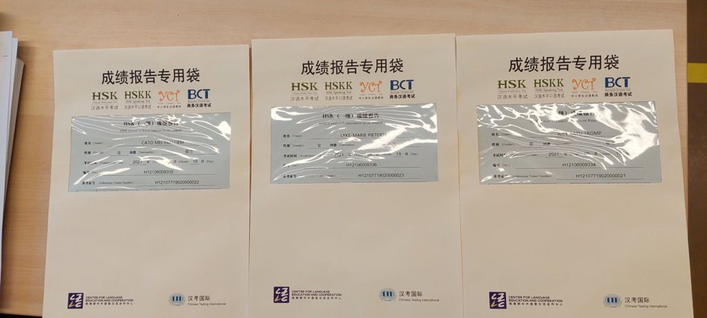 Idse Tromp uit klas 3 en Lyke-Marie Pieterse en Cato Liem uit klas 4 ontvangen van hun enthousiaste docent Chinees Yun Xie het behaalde HSK diploma.